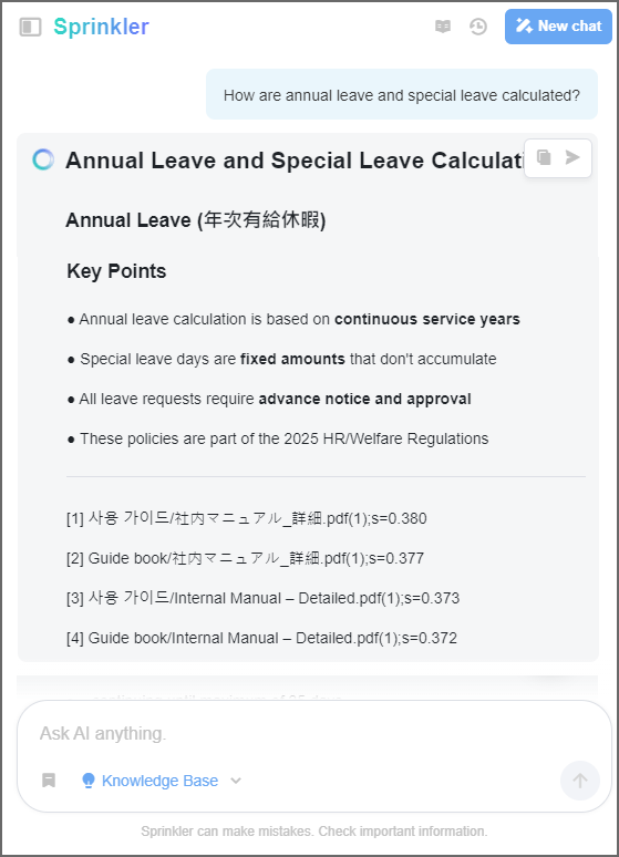 Knowledge Base (RAG) is an AI-powered document search system that provides accurate answers by searching through documents and information stored in the Knowledge Base Drive when a user asks a question in natural language.Unlike simple keyword searches, the Knowledge Base understands the meaning and context of the question to deliver the most relevant information.