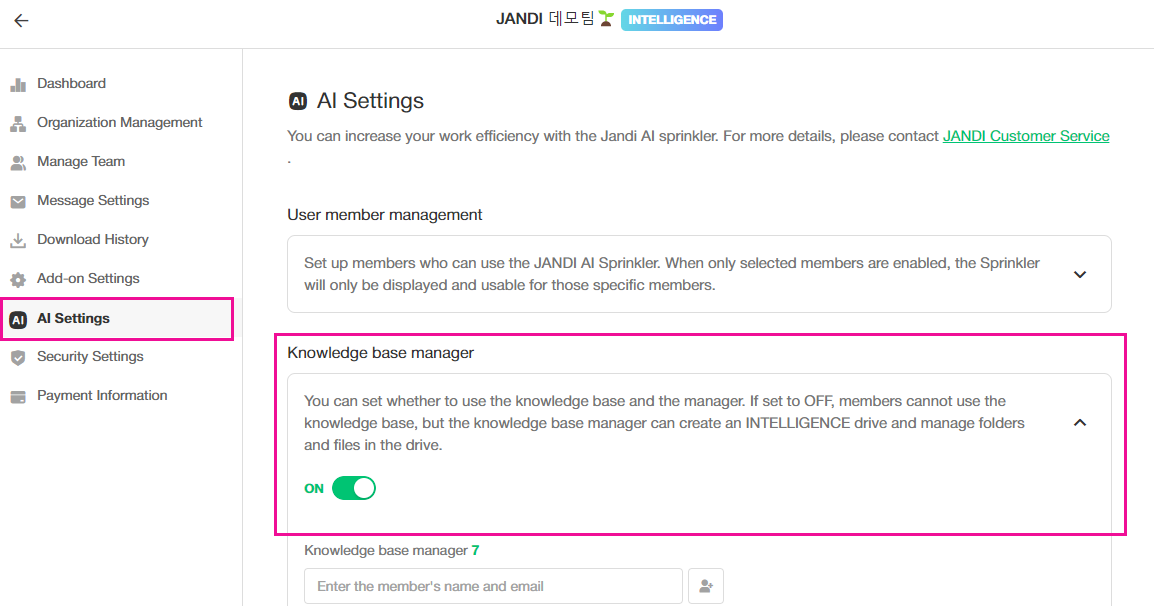 From the PC/Web top navigation bar [≡] → Admin menu → AI Settings → Knowledge Base Manager → Add members who can access the Knowledge Base Drive.