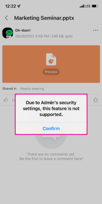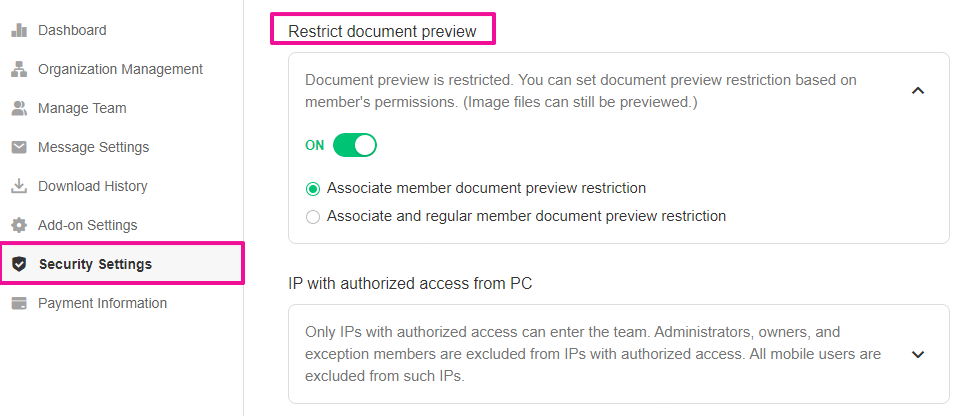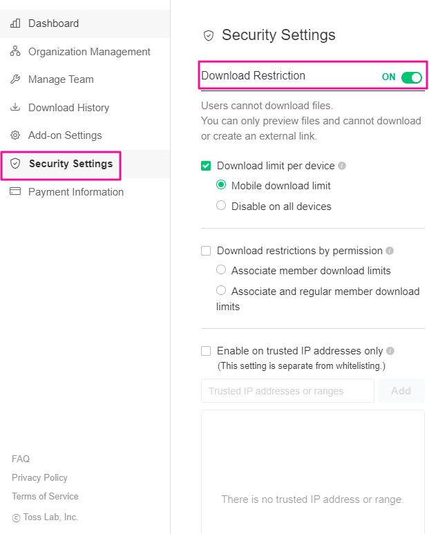 Go to [Security Setting] > [Download Restriction] to select options for file download restriction. *Keep in mind that members can preview the file no matter the restriction settings. Select the restriction options suitable for your team.