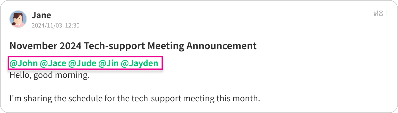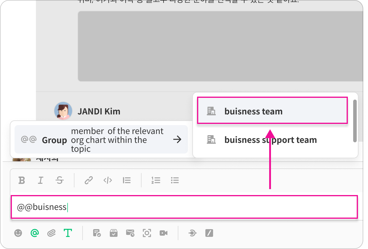 1. Type @ in the message input box to open the mention feature, and type @ again to open the group mention feature.