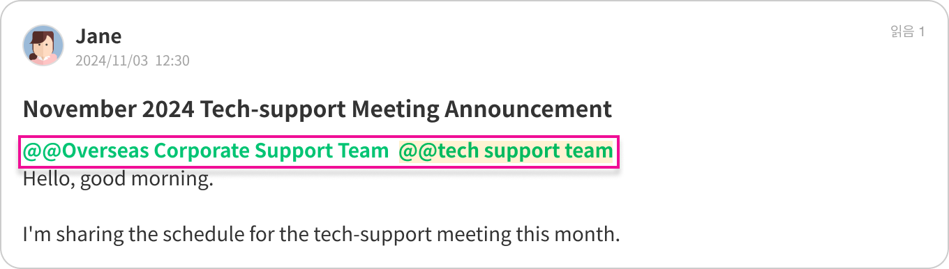After the update: Use the organization mention feature to @mention a group in the org chart.
