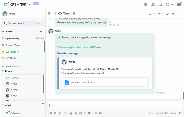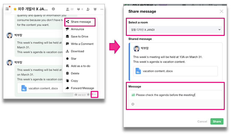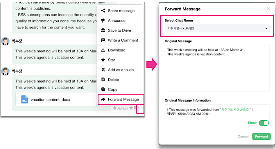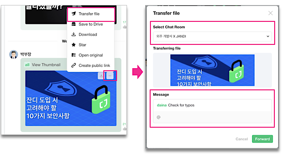 How to: Go to See More [...] -> Transfer File -> Select a Chat Room -> Forward
