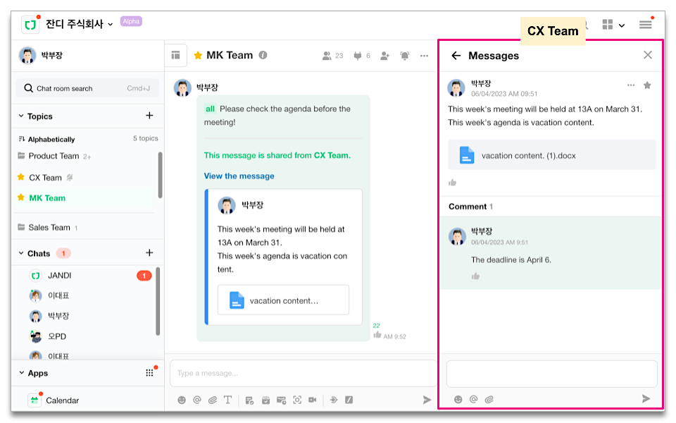 If you can join the chat room with the original message(i.e. CX Team), you can view the comments on the message in the chat room where the message was shared(i.e. MK Team).