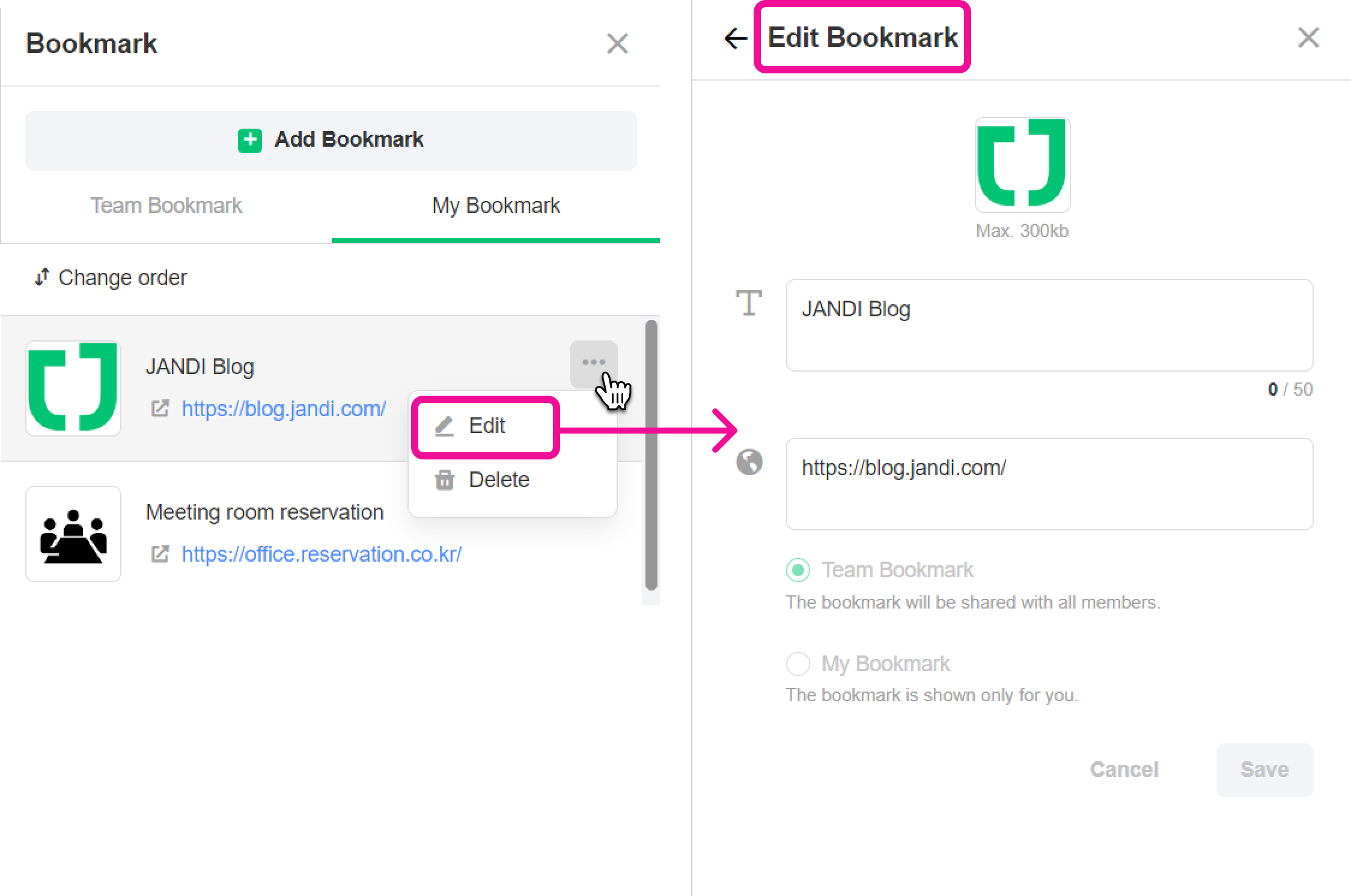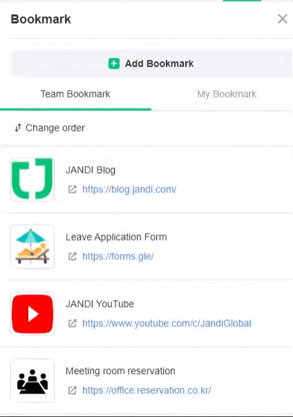 Member's editing/deletion authority is applied according to the team bookmark creation settings.