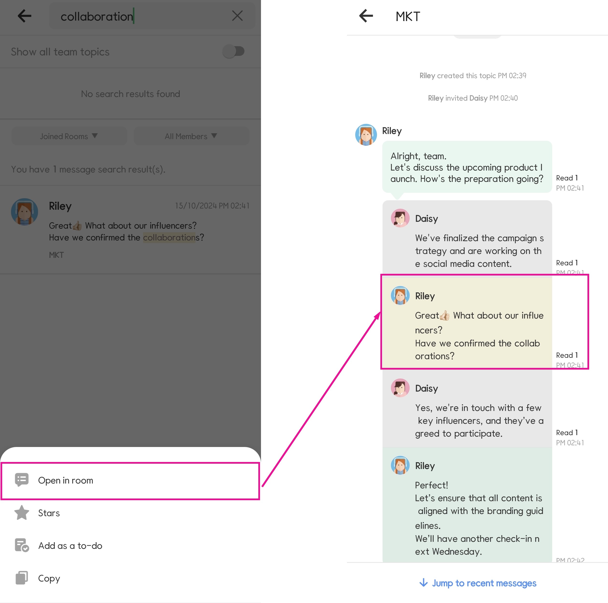 Now, you can simply click the searched message to move to the chatroom to view the overall context.