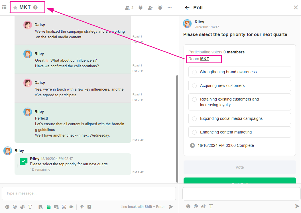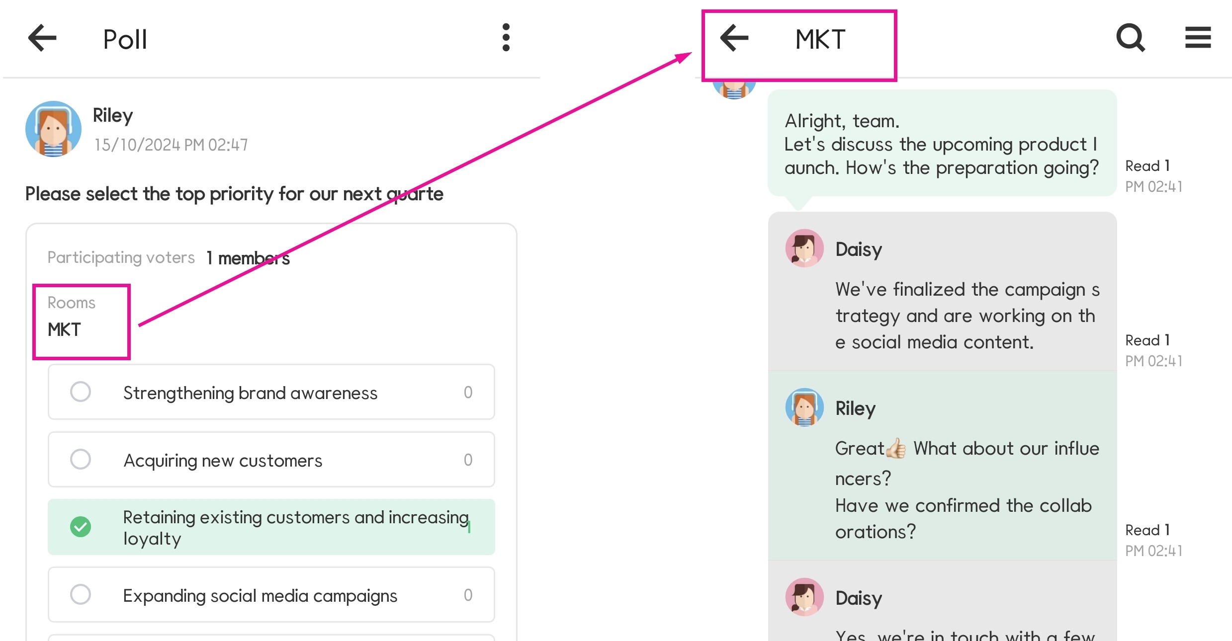 We added a new feature that allows you to move to the chat from the detailed view of messages, polls, and to-dos.
