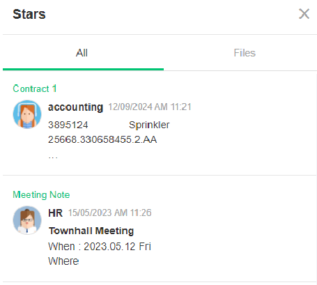 Starred items, including messages, posts, and files, were listed based on the initial starred date, making it difficult to sort them by dte and chatrooms.