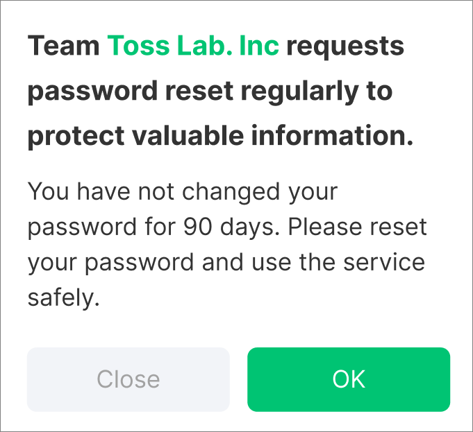 When the password reset feature is activated, when a member who has no history of changing their account password or has changed it for more than 90 days enters the team, they will be requested to reset their password, as shown in the image below.