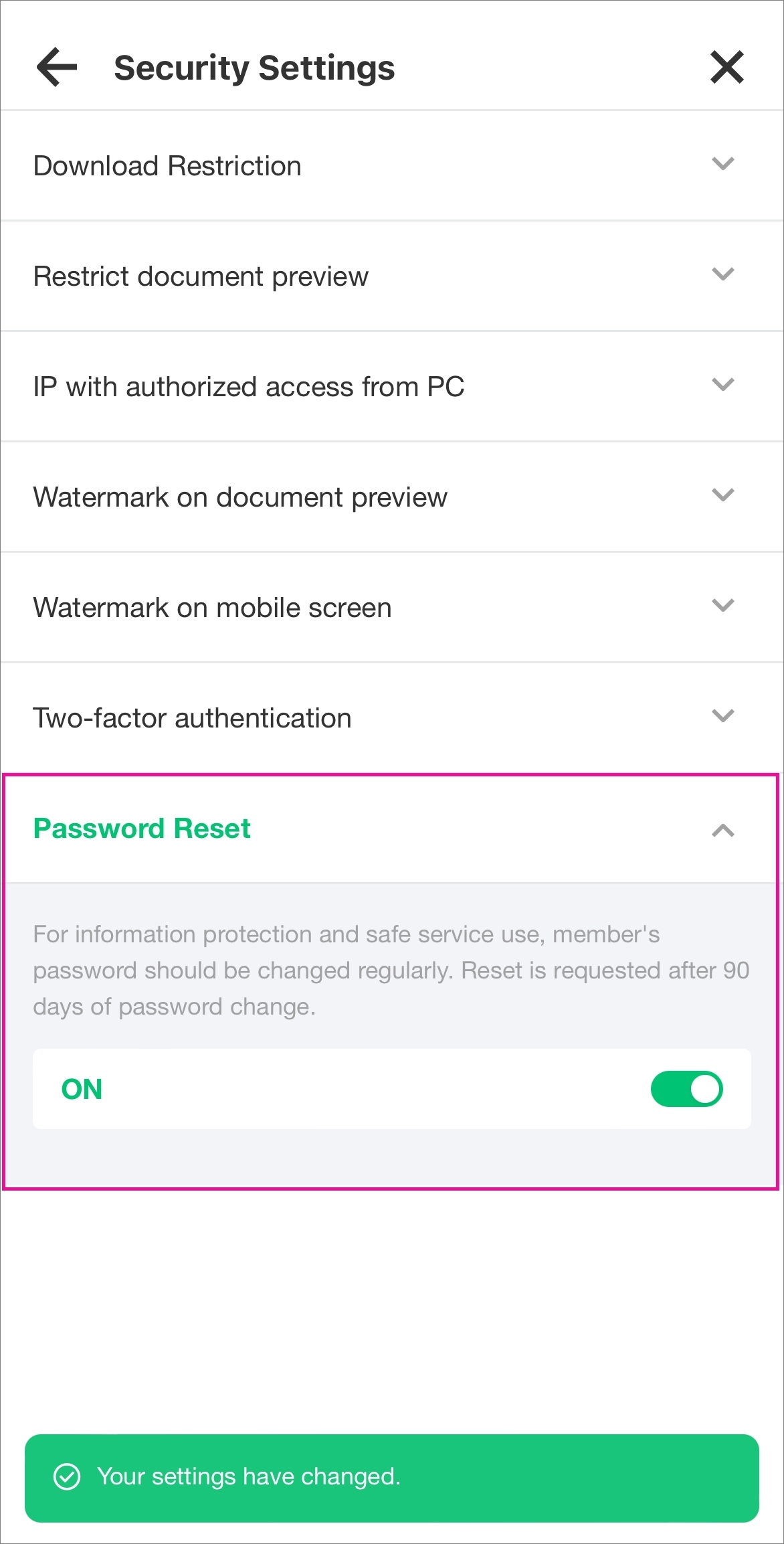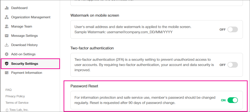We have added a new password reset setting to enhance the security of the team (company) as well as the individual account security of members.