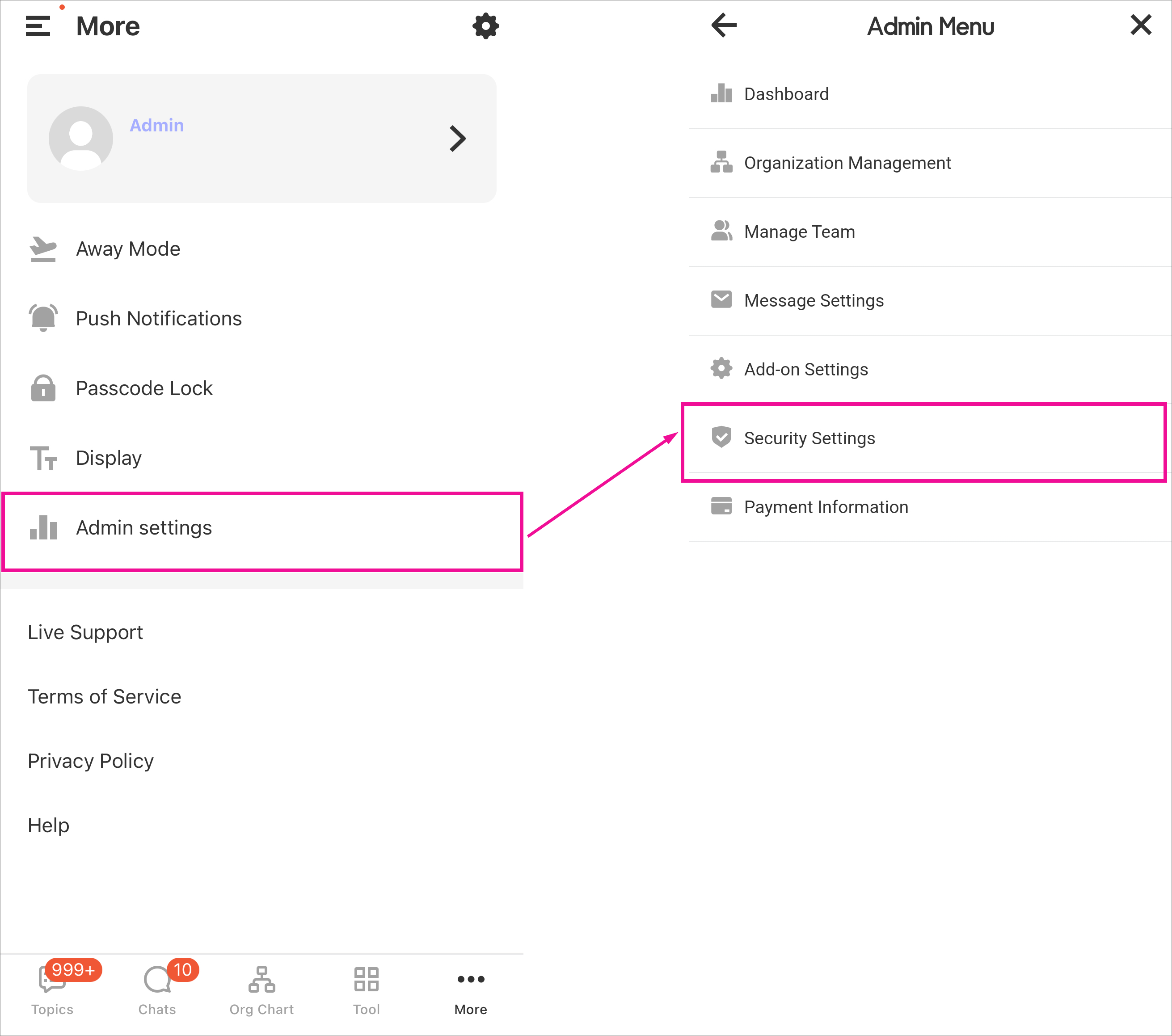 1. Go to the [...] more tab on the bottom of your JANDI app > Admin Menu > Security Settings