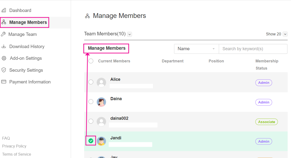 If there have been any personnal changes in your team, the Team Admin can go to [Admin Menu] to switch a member to a Team Admin, transfer team ownership, block, or dismiss a member.