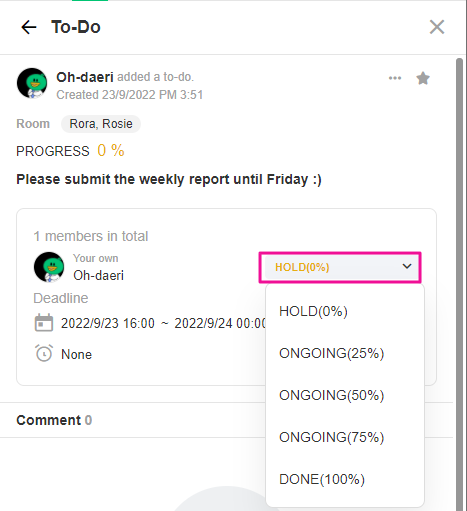 If you change the To-Do Topic, JANDI will reset the uploaded attachments and assignee information. Please be careful.