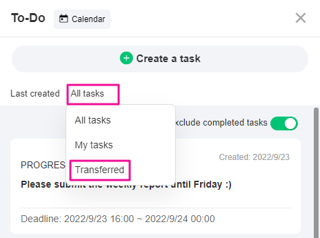 When you create and assign another member to the task, go to [Transferred tasks] - [All members] to view all the assigned tasks.