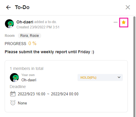 When you first create a To-do, JANDI will automatically send you a private to-do in JANDI on your chat list. If you want to assign members or set the to-do as a specific project, choose the chat room you wish to share the to-do and assign a member for that to-do.