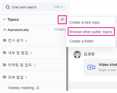 On the Topic list located on the left of your JANDI screen, select the (+) icon on the top of the list and then select [Browse other public topics].