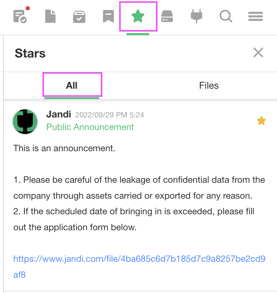 On the menu bar on the right side of your JANDI screen, select the ⭐ icon on the bottom to see all the items you have star marked.