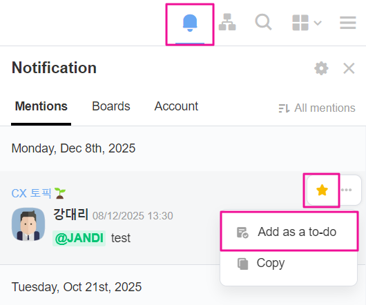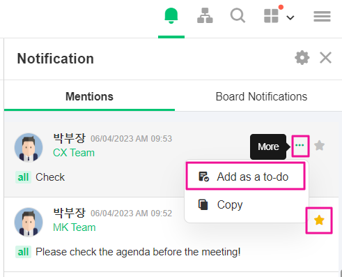 How to create a task: Hover to the right side of the message and select the more [...] icon > [Add as a to-do]
