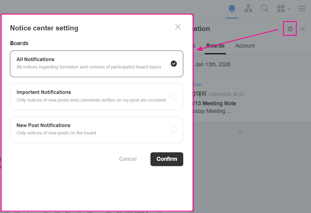 How to: Select [Settings] on the upper right side of the notification center > Choose either Total / Important Notices and select [Confirm]