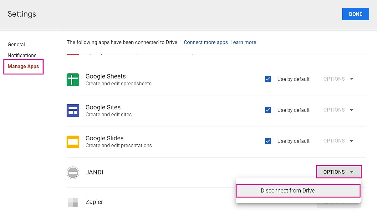 Click ‘Option’ next to JANDI and select [Disconnect from Drive].