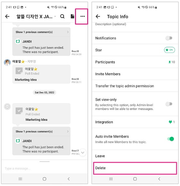 Once you are in the Topic, select the [...] icon on the upper right corner. In the Topic Info page, select [Delete] located on the bottom.