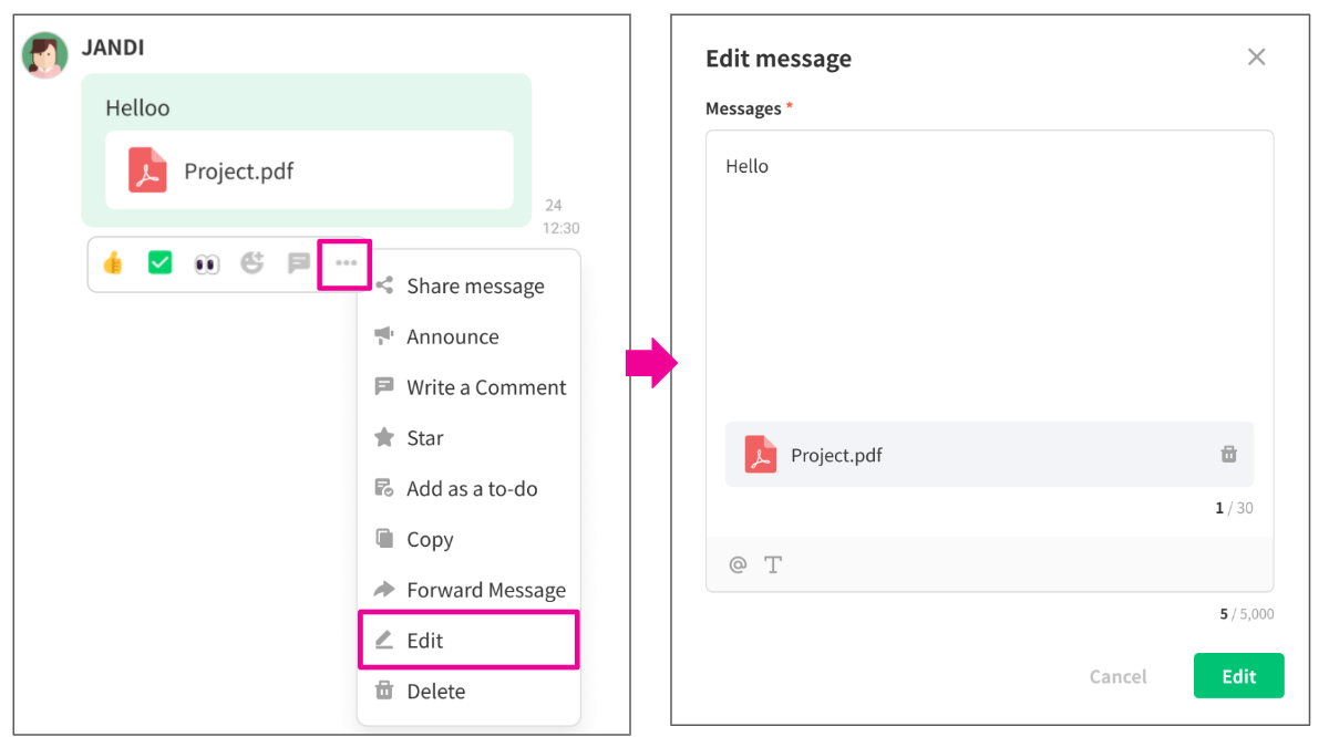 Only the author can edit the message, and (edited) will be displayed on the message.