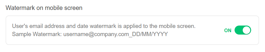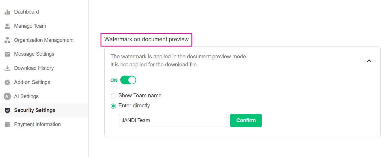 By turning this feature on, document previews will show watermarks. There are two options for the watermark setting: Show team name or Enter directly.