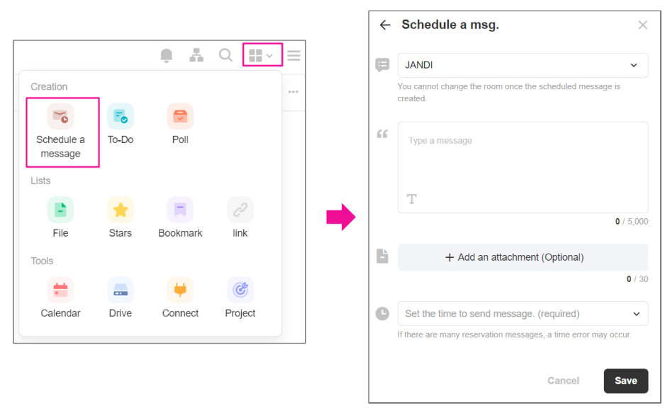 If you have a message that you must send to other members at a specific time, try scheduling a message! Members can save up to ten scheduled messages. You can schedule up to 90 days based on the sending date with 15 minutes increments.