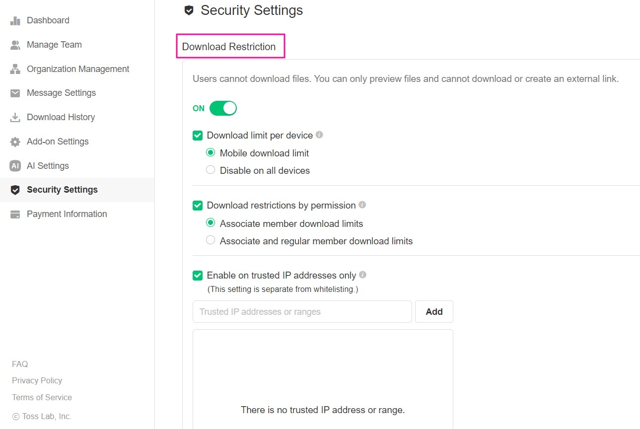 The Team Admin can put restrictions on downloading files for the PC or Mobile JANDI app. The preview for files is allowed.