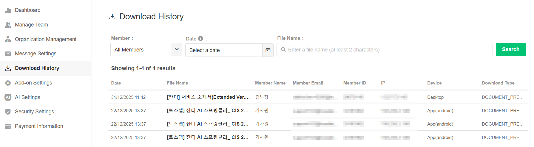 If the Team Admin needs to check the file downloads log, it is available on the [Admin Menu] - [Download History]. You can search the file name to view downloads and preview history of the files shared in your team.