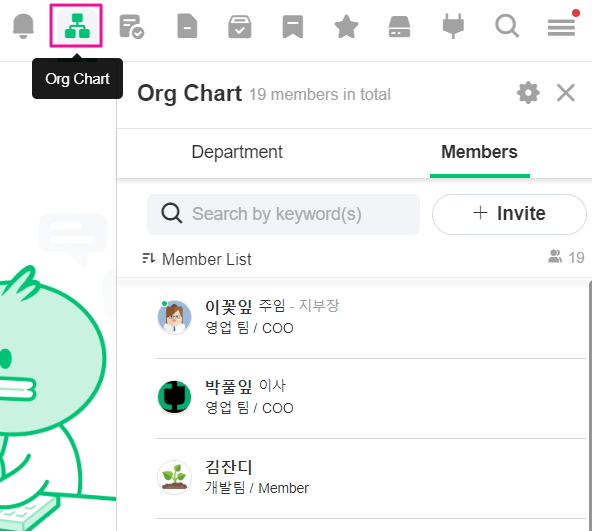 • On your PC or Web JANDI, select the org chart icon to search by members or departments.