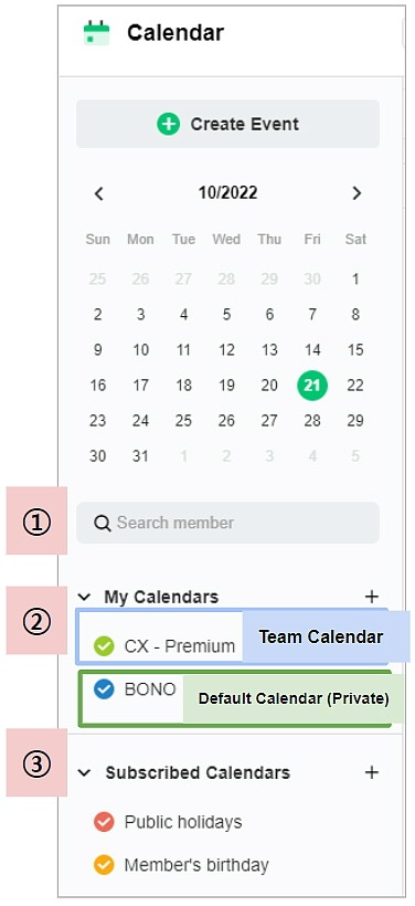 ③ Subscribed Calendars: Subscribed calendars display national holidays (depending on your settings) and members' birthdays.