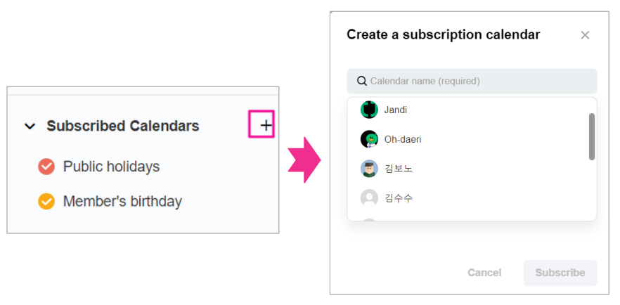 - Simply use the + add button, search for a specific member, and subscribe to view their calendars. If the members set up their calendars as private, you cannot subscribe to their calendars.