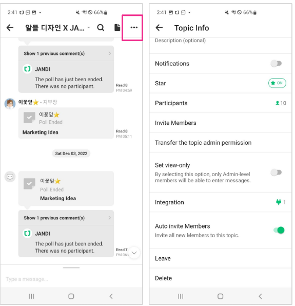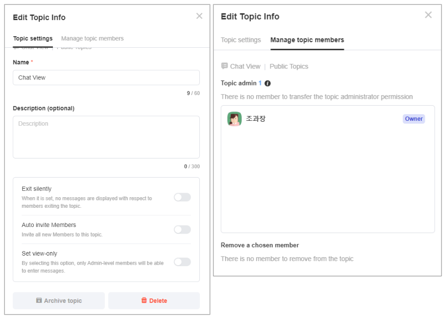 Topic settings : Name, Description, Exit silently, Auto invite Members, Set view-only, Archive topic, Delete