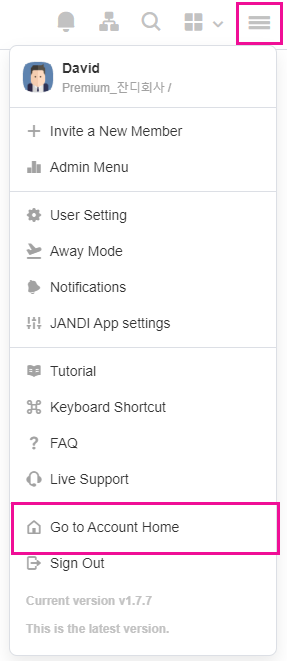 Go to the menu [=] > [Go to account home] and select [Account settings] on JANDI main page.