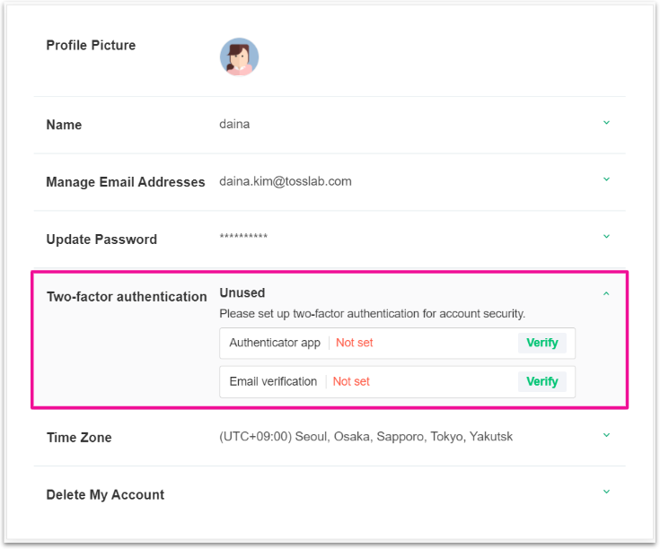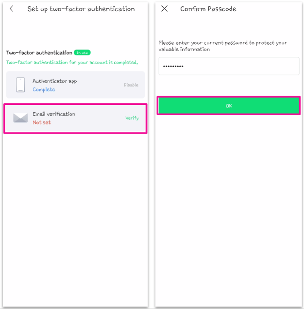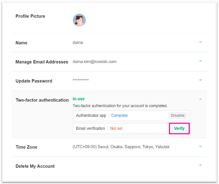 1. Go to [two-factor authentication] > Email Verification > [Verify].