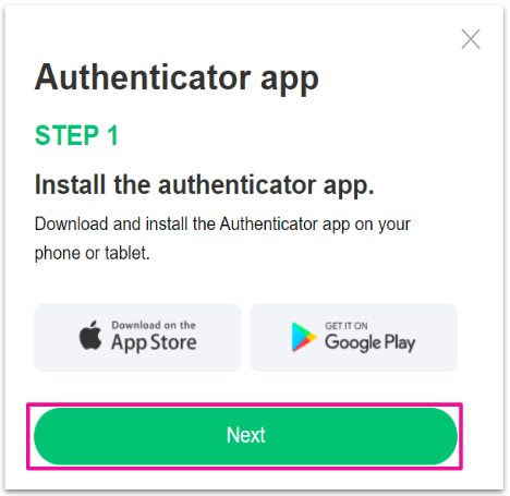2. Download an OTP app on your mobile app store. If you select the Google Playstore button, you will be moved to the playstore app. Download the app and come back to the JANDI app, then select [Next].