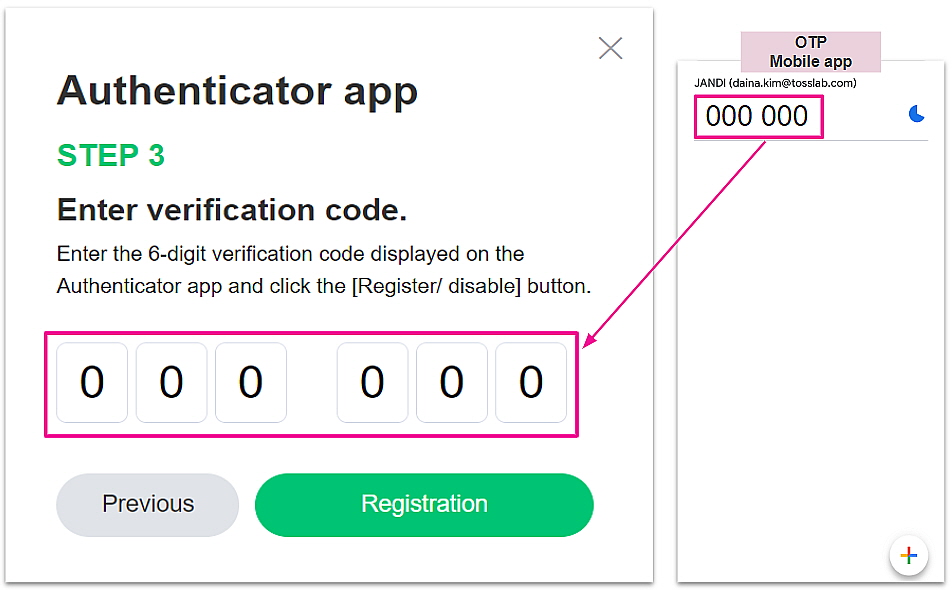 3. (1) Copy the code provided by JANDI. (2) Paste the code to your mobile OTP app.