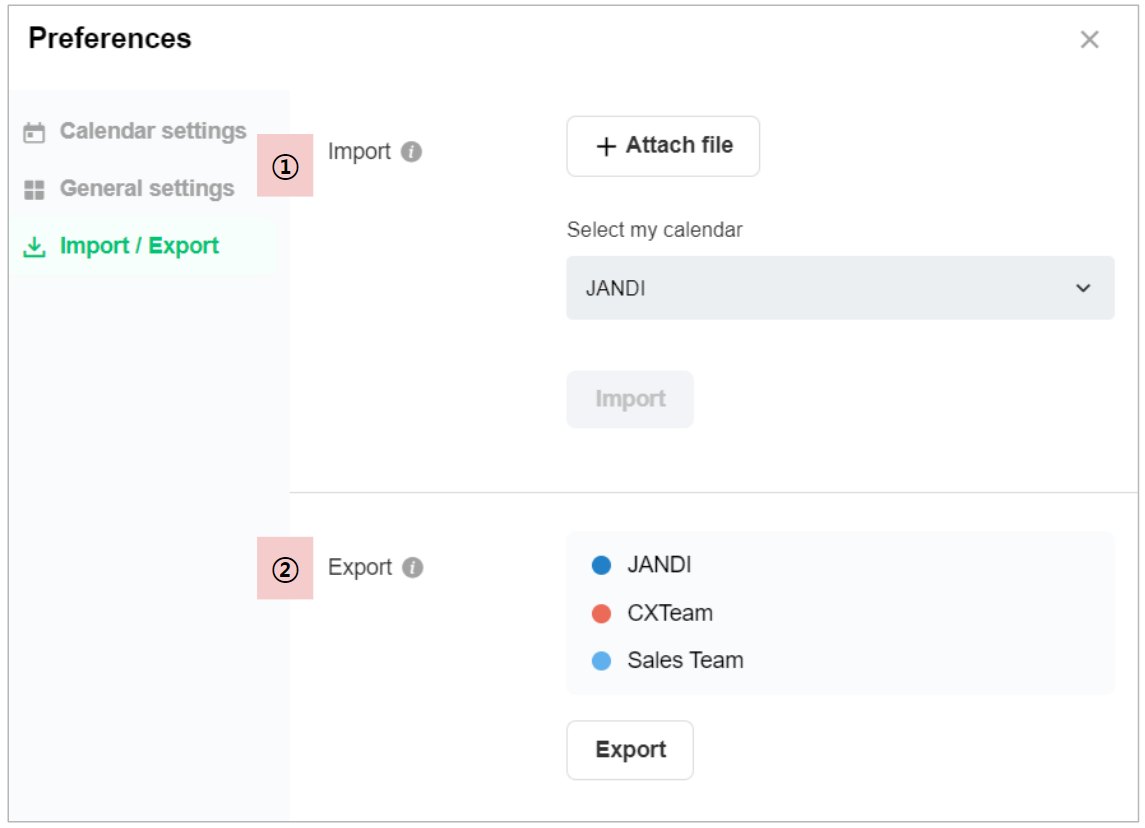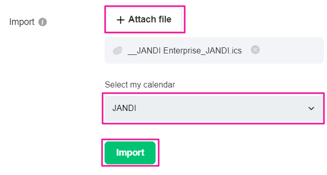 ① Import: Attach the calendar file (.ics) by selecting + to import the events in the file to your calendar.