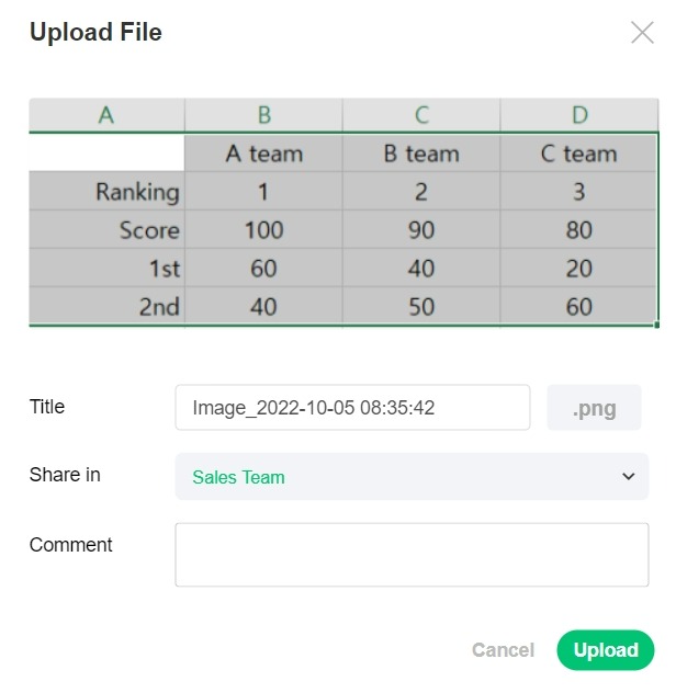 Paste the table directly in the message box (Ctrl + V), and the file upload window will pop up right away.