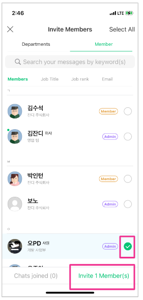 2. Choose the members you want to invite to the topic. You may use the filters to search for specific members. Also, by checking the [Select all members] box, you can choose to invite everyone in the search results. After deciding who you want to invite, select [Invite].