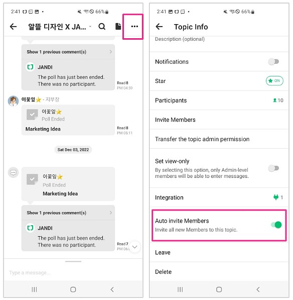 Select the [...] icon on the Topic’s upper right corner and turn on [Auto Invite Members].