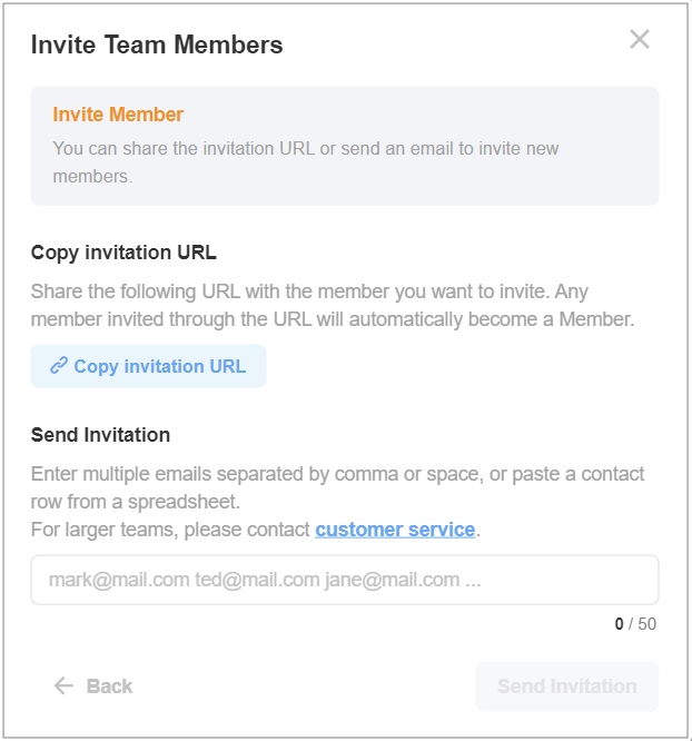 However, if your Team Admin has disabled the invitation settings, members cannot invite other people to the team. Please ask your Team Admin to select [Allow Invitations] settings to [Enabled For all Members].