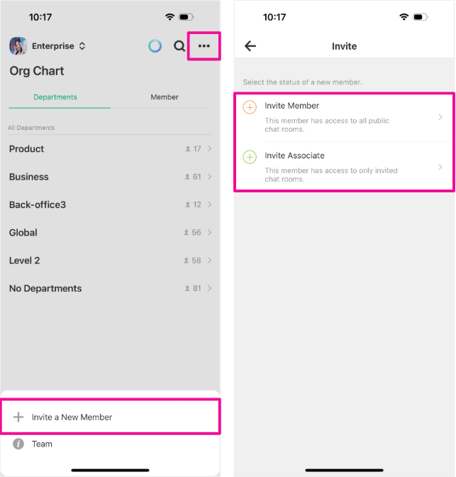 Go to the [Org Chart] tab on the bottom of your screen and select the [...] > [Invite a New Member] icon on the lower right corner to invite a Member or an Associate.