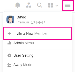 Select the [≡] icon on the upper right corner of the JANDI screen, and click on [+Invite a New Member].