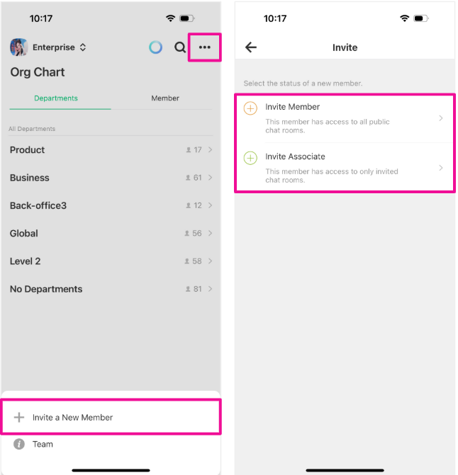 Go to the [Org Chart] tab on the bottom of your screen and select the [...] > [Invite a New member] icon on the lower right corner to invite a Member or an Associate.