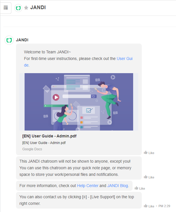 Your JANDI chat room is for your personal use, so if you have any questions on how to use JANDI, please go to the menu and select [Live Support] and our JANDI customer representative will help you.