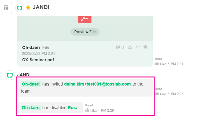 If you are the Team Admin, your JANDI chat will message you to let you know if anyone has joined the team or has been blocked.
