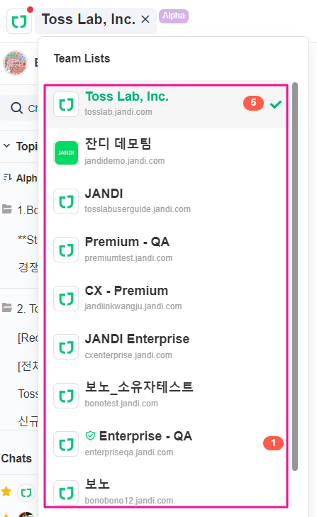 On the upper left corner of your JANDI screen, click on your team name and select the team you want to switch to.