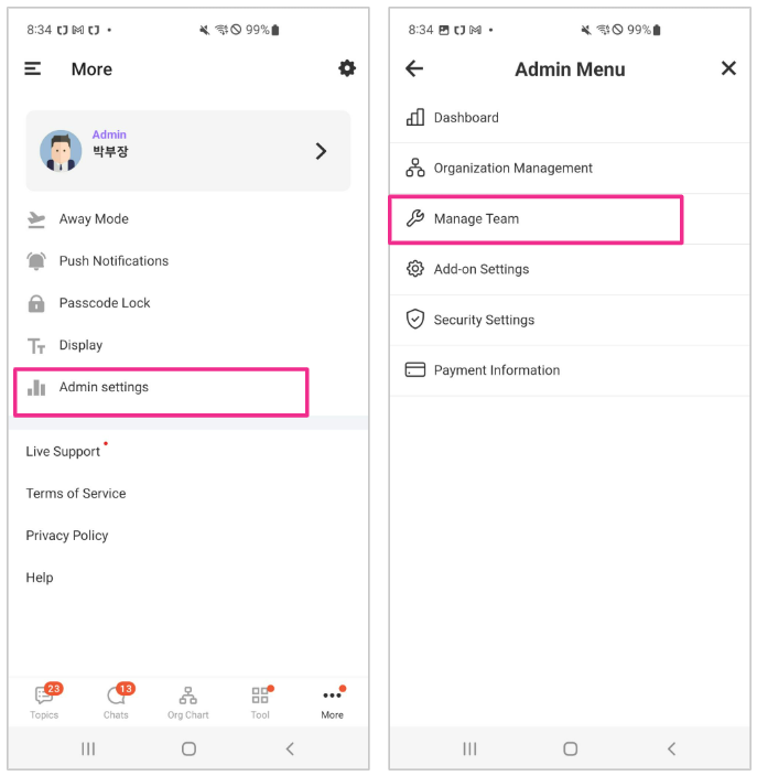 1. Go to the more [...] icon at the lower right corner of the mobile app. Then go to [Admin Settings] > [Manage Team].