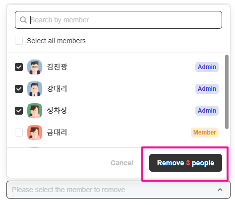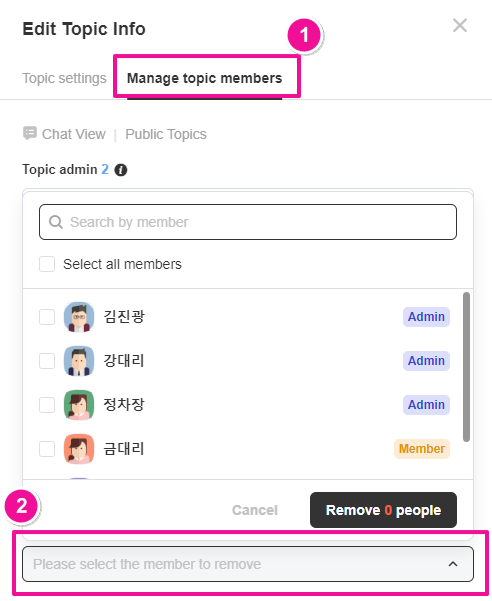 The Topic admin and the Team admin has the authority to remove members from a Topic. If you have to remove members from a Topic due to changes in personnel, please refer to the following.